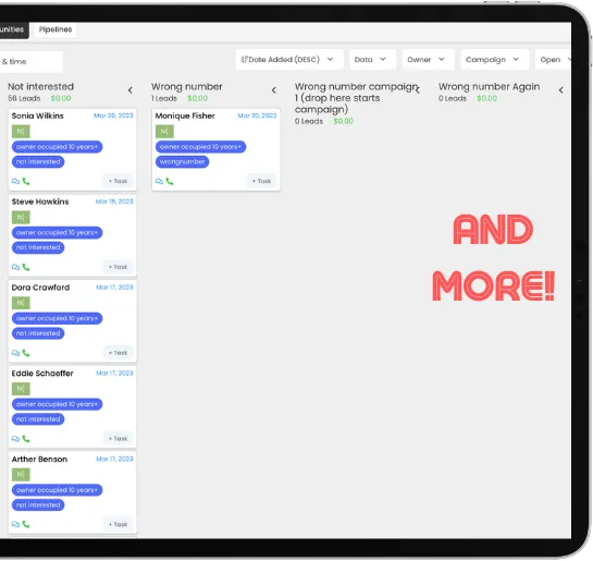The data pipeline is for organizing your results from the text blasting campaign, like wrong numbers, not interested, dnc, wrong number campaigns, leads that don't reply to campaign and a single line dialer for missed calls!