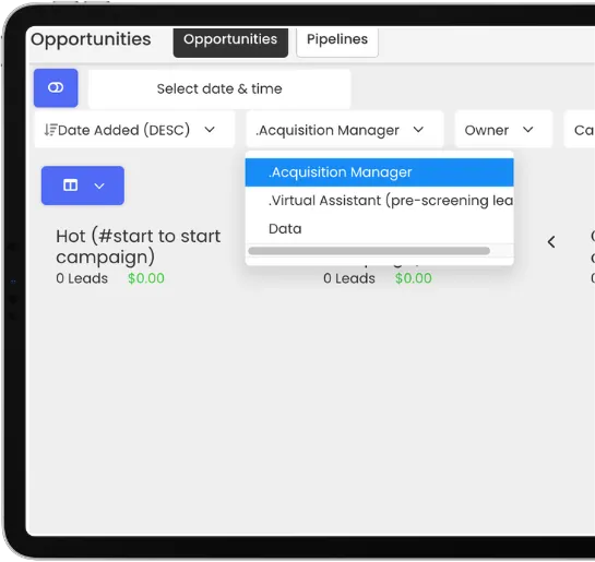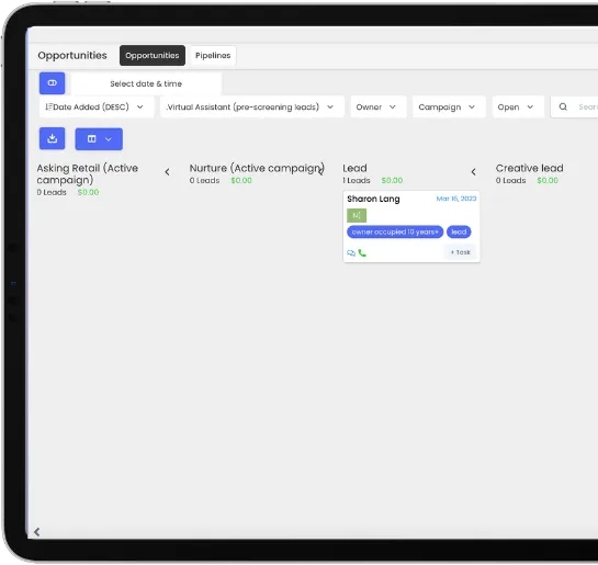 The Virtual Assistant Pipeline is for leads who respond positively. You can add leads to nurture and retail campaign. You or Your Virtual Assistants will be pre-qualifying sellers before pushing to the manage pipeline.